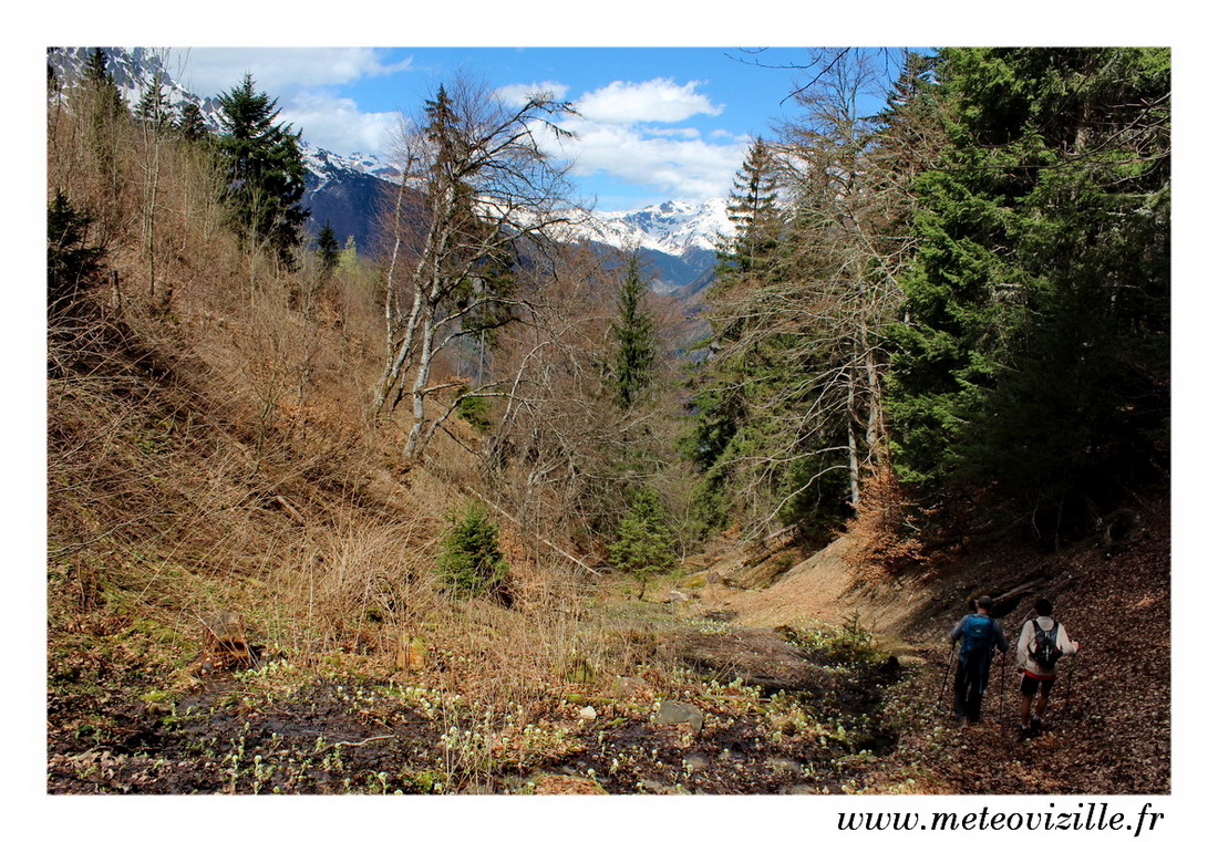 On aperçoit une de nos randos de cette fin d'hiver : Côte Mouton, c'est la petite bosse enneigée de droite, entre les deux bosses c'est le col du SabotAprès le déjeuner nous rejoignons Sardonne en ne suivant pas les panneaux qui après une rivière nous indiquaient de continuer tout droit, nous préférons descendre le long de la rivière, le GPS montre une trace et effectivement il y a bien un sentier qui en plus sera balisé par des marques jaunes !